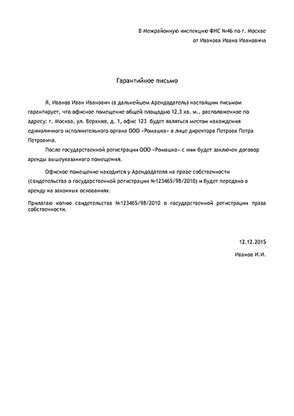 Гарантийное письмо составляется на основании запроса арендатора. После того, как от арендодателя поступил данный документ, его требуется представить в налоговую инспекцию в целях регистрации либо переоформления юр. адреса.