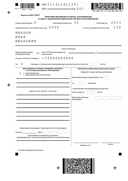 - Первая страница. Вписывается ИНН, а далее проставляются коды. В поле с номером корректировки - код “0”, указывающий на первичную подачу декларации. В графе “налоговый период” - код “34”, это значит 1 год. Графа “по месту учета” заполняется кодом “120”. После этого вы вписываете свои ФИО в данные налогоплательщика без указания на статус ИП и заполняете поля о достоверности предоставленной информации.