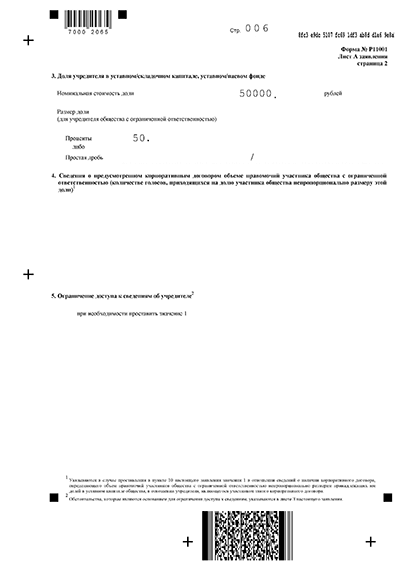 Когда общество учреждают несколько участников, на каждого из них заполняется свой лист И. На странице 3 подпись следует ставить в присутствии налогового инспектора или нотариуса - в зависимости от способа подачи. Если заявление по форме Р11001 подается по почте, курьерской службой или представителем по доверенности, то подпись должна быть удостоверена заранее нотариально.