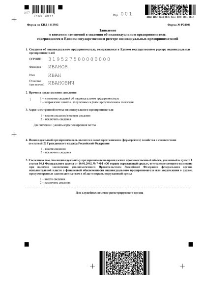 - Если ошибку допустили вы, когда заполняли форму Р24001, то нужно снова подать Р24001. На странице 001 в пункте 2 выберите код “2”. Он означает, что изменения в ЕГРИП вносятся, чтобы исправить ошибки, допущенные в представленном ранее заявлении.