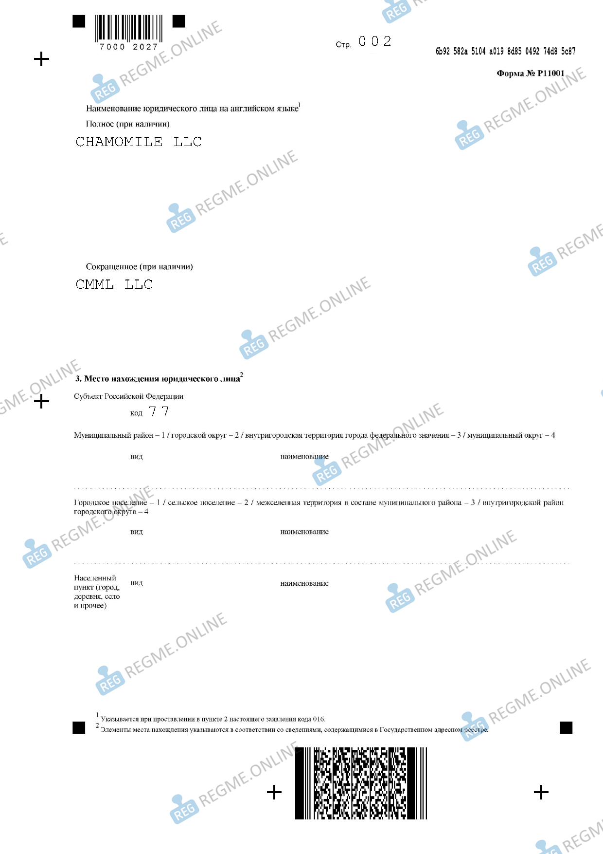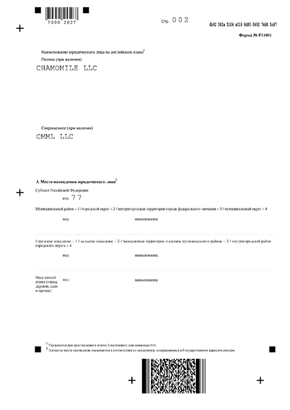 В пункте 1.1 укажите полное название компании, начните со слов “ОБЩЕСТВО С ОГРАНИЧЕННОЙ ОТВЕТСТВЕННОСТЬЮ” и далее - название на русском языке. Если есть сокращенное наименование, впишите его в пункте 1.2, начиная с аббревиатуры “ООО”. Если сокращенного названия нет, оставьте этот пункт пустым.